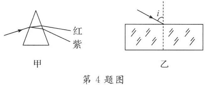 4. 如图所示,甲图是一束太阳光通过三棱镜后的色散现象,乙图是一细束红光和一细束紫光以相同的入射角i从空气射入长方体玻璃砖的同一点,并且都直接从下表面射出。对于这一过程,下列说法中正确的是(