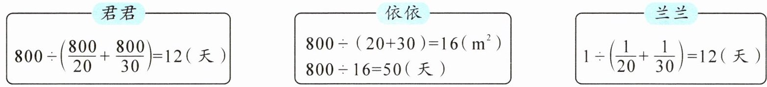 2. 新题型 公交公司新建一个占地 $800\ m^2$ 的 5G 智慧停车场, 招标时, A 公司计划 20 天完成, B 公司计划 30 天完成。两公司合作, 预计多少天完成? 下面是 3 位同学的不同解法。