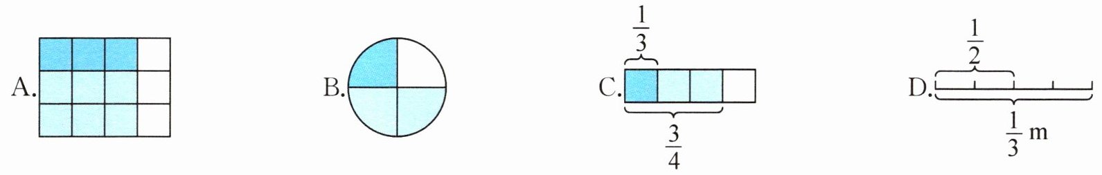 1. 数学家华罗庚曾说过:“数缺形时少直观。”如图所示,下列各图中$\boldsymbol {不能}表示\dfrac{3}{4}× \dfrac{1}{3}$的是(