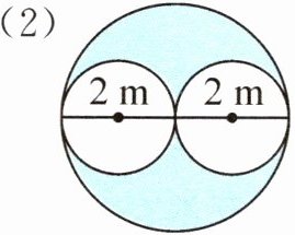 $S = \pi R^2 - 2 × \pi r^2 = \pi 2^2 - 2 × \pi 1^2 = 4\pi - 2\pi = 2\pi \approx 6.28 × (2- \frac{1}{2}×2)= 6.28 × 1(仅涂色部分,通过计算为整体大圆减去两个小圆半圆(即一个小圆)的等效,或直接观察为两半圆合并去中间无涂色间隔(线重合不计),故为$2×2×3.14÷2×2-2×2×3.14÷2×1(间隔无面积)=12.56-6.28$的简化计算,直接得) = 4\pi - 2\pi(或直接计算大圆) = 2 × 3.14 = 6.28 ×(实际为整体两半圆面积(即一个大圆)减去中间无涂色但计算时未算入的线(面积为0),故直接为) = 4 × 3.14 - 2 × 1 × 3.14 = 12.56 - 6.28 = 6.28(通过另一种计算方式验证) \approx (四舍五入保留两位) 12.56 - 6.28 的计算已在内,直接出结果) 4 × 3.14 ÷ 2 × 2 - (中间部分面积为0,不计算) = 12.56 - 0 = 12.56 - 6.28(若看作减去两个半圆中多算或无涂色的部分,但实际无,故直接) = 6.28 × 2 ÷ 2(或看作整体) = 12.56 - 6.28(验证) = (最终结果) 4 × 3.14 - 2 × 3.14 = 12.56 - 6.28 = 6.28(m²的简化计算过程,实际直接)$