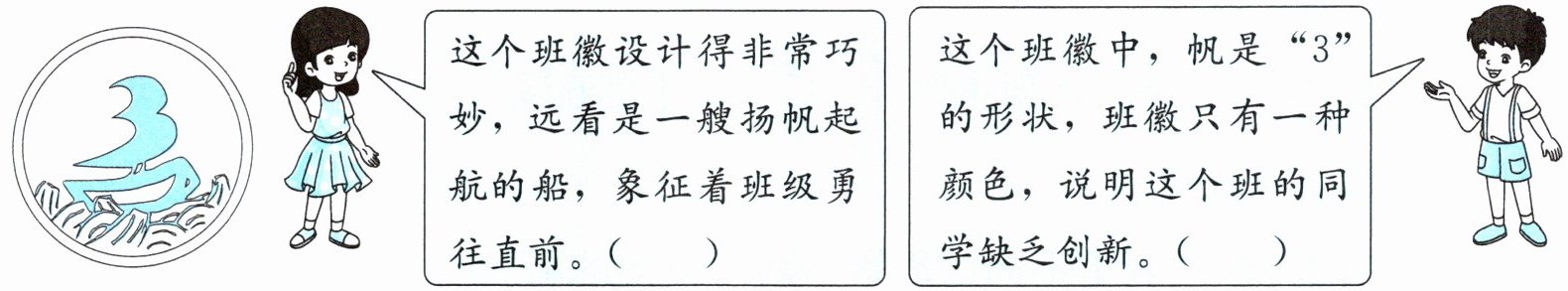 1. 四年级(3)班的同学参加了班徽设计大赛,其中一名同学设计了如下的班徽。仔细观察这个班徽并判断同学们的观点是否正确,正确的画“√”,错误的画“×”。