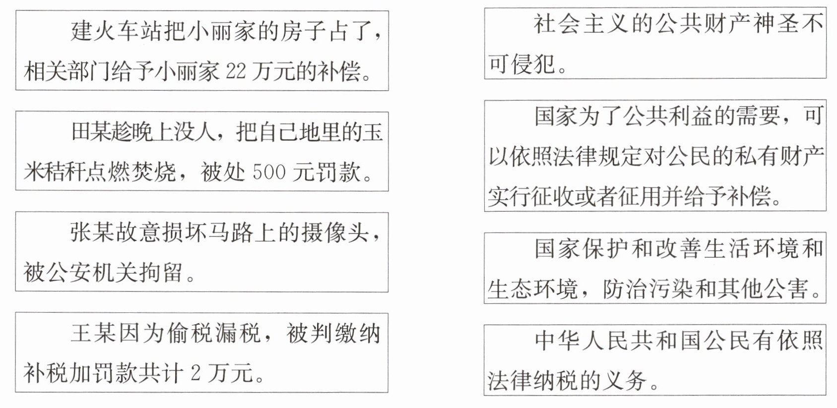 将生活中的场景与宪法中相对应的法条用直线连起来。