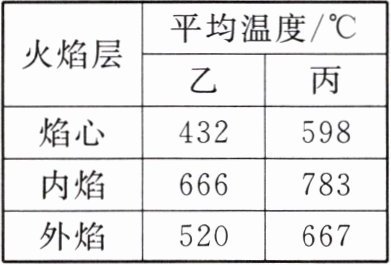 (2)定量研究:乙和丙两名同学在老师的指导下,分别利用高温传感器测得酒精灯各层火焰平均温度,如表所示。