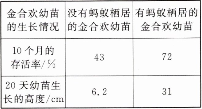 10. 为了研究蚂蚁对金合欢幼苗生长的影响,某科学兴趣小组同学进行了实验探究,得到了如表所示的实验结果。根据表格内容分析,下列说法正确的是(