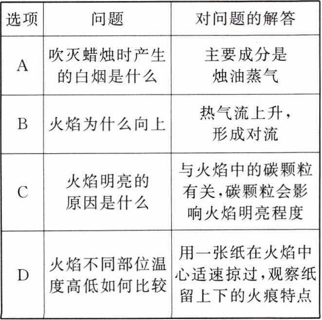 11. 法拉第曾以《蜡烛的故事》为题为青少年连续开展了多次报告。表中列举了报告中涉及的部分问题及对问题的解答。则下列解答中属于设计实验方案的是(