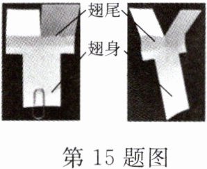 15. 如图所示是在空中释放时能旋转下落的纸蜻蜓。小明和小红为探究影响纸蜻蜓下落快慢的因素,取翅身、翅尾长度不相同的纸蜻蜓,并改变回形针的数量,从 $ 2.5\ m $ 高的平台静止释放后记录落地的时间,实验结果如表所示(为保证纸蜻蜓的下落轨迹呈直线型,选择在无风的环境中进行实验)。
