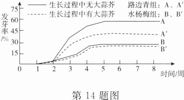 14. 探究某地区外来植物大蒜芥对水杨梅、路边青两种本地植物种子发芽的影响,研究结果如图所示。下列叙述中,正确的是(