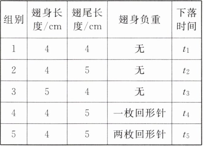 (3)研究翅尾长度的影响时,需控制翅身长度和负重相同,仅改变翅尾长度,符合条件的是组别1(翅尾4cm)和2(翅尾5cm)。