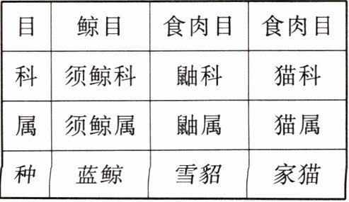 4. 如表所示是蓝鲸、雪貂和家猫三种哺乳动物的分类,具有较近亲缘关系的两种动物是(