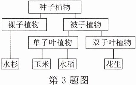 3. 如图所示是几种常见植物的分类情况,图中四种植物亲缘关系最近的是(