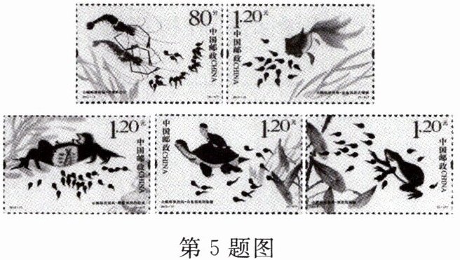 5. “我们的妈妈呢?我们的妈妈在哪里?”你是否还记得故事《小蝌蚪找妈妈》里这句经典的问话。如图所示为根据该故事情节发行的一套水墨邮票,请据图回答下列问题: