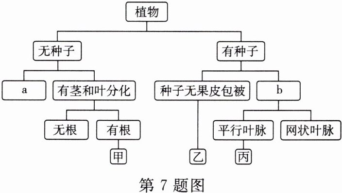 7. 小华学习了生物的相关知识后,对生物的分类产生了兴趣。在老师的指导下,编制了一张如图所示的植物分类检索表,请回答下列问题: