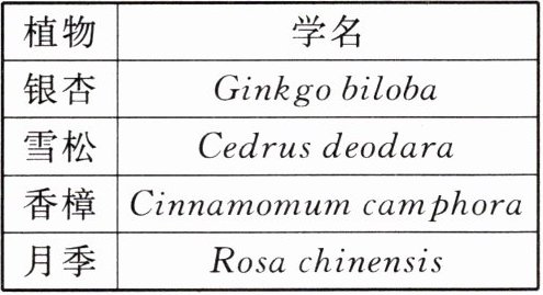 (填写植物名称)的叶片。(3)小乐在校园中还发现了玫瑰,其学名为 Rosa rugosa(前者为属名,后者为种加词),在表格四种植物中,与玫瑰亲缘关系最近的是