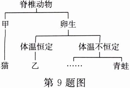9. 如图所示是一幅不完整的检索表,用它对猫、鸡、蛇、鳄鱼和青蛙五种动物进行分类,则图中甲处的分类依据是