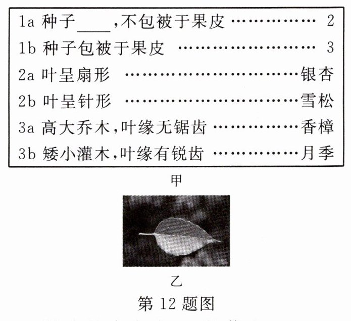 12. 如图甲所示为小乐对校园常见的四种植物编制的二歧分类检索表,如图乙所示为上述四种植物中某种植物的一片叶。回答下列问题: