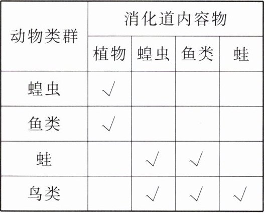 (2)小科根据所学的科学知识对下列动物类群进行解剖分析时,发现各类动物的消化道内容物如表所示(“√”表示有此类残骸)。请你根据表格所列关系,写出一条食物链: