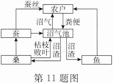 11. 如图所示为我国南方的一种新型的“桑—蚕—气—鱼”农业模式,该模式将蚕沙(蚕粪)、人畜粪便、枯枝败叶等投入沼气池发酵制成沼气,用沼渣喂鱼及为桑树施肥,获得了鱼、蚕、桑、气的全面丰收。请分析回