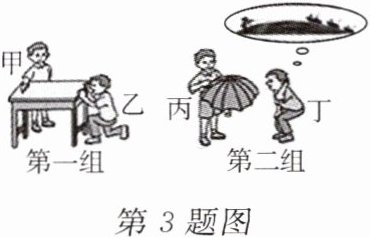 3. 老师为了让课堂更加生动直观,组织同学一起演示了如图所示的探究活动。第一组:甲同学拿帆船模型由远到近向桌子一侧移动,让乙同学观察帆船的变化;第二组:丙同学手拿帆船模型,由雨伞一侧向位于雨伞另一侧移动,让丁同学观察帆船的变化。你认为这个探究活动所蕴含的科学知识是(