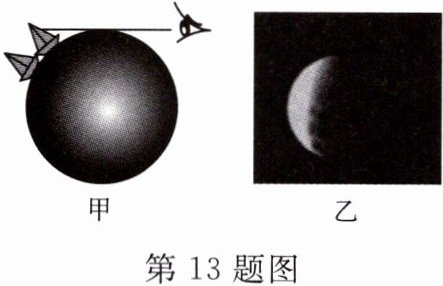 13. 在日常生活中,我们在海边看到帆船从远方驶来,总是先看到桅杆,再看到船身,如图甲所示;还有发生月食时,在月球表面可以看到弧形的地球影子边缘,如图乙所示。如果只根据上述两个例子,是否就可以得出地球是球体的结论?你的理由是什么?