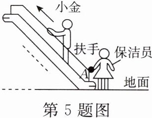 5. 如图所示,小金静止站在商场的电动扶梯上,随电动扶梯一起上升,保洁员站在地面上,将抹布放在扶手 A 端,手和抹布都保持不动,下列分析错误的是(