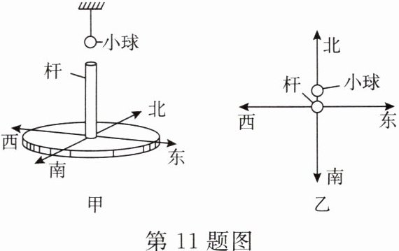 11. [模型建构]静止在水平地面上的竖杆装置如图甲所示,装置基底固定着一根竖直的杆,杆顶正上方固定悬挂着一小球。现竖杆装置开始沿某一水平方向做直线运动,一段时间后俯视图(装置基底未画出)如图乙所示。请由此判断竖杆装置正在向哪个方向运动(