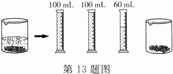 13. 莉莉去商场买了一杯320mL的珍珠奶茶,她想知道这杯珍珠奶茶中“珍珠”占了多少体积。于是,她拿一个500mL的烧杯,把珍珠奶茶全部倒入烧杯里,再把烧杯里的奶茶倒入三个量筒中,直到液体全部倒完,结果如图所示,则“珍珠”的体积约为(