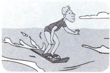 A. He buys clothes. B. He watches a movie. C. He surfs and swims.