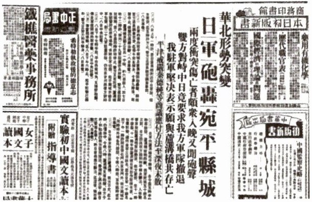 材料三 下面是 1937 年 7 月 9 日出版的《申报》的照片,上面刊登了新闻《华北形势突变 日军炮轰宛平县城》。