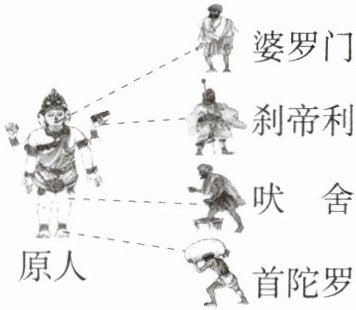 材料 婆罗门宣扬:“造物神的嘴演化出婆罗门,手生出刹帝利,腿生出吠舍,脚生出首陀罗。”(见下图)