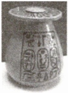 1. 右图中的石瓶是古埃及国王阿蒙荷特普三世(也译作“阿蒙赫特普三世”“阿蒙霍特普三世”)的王后提伊(也译作“泰伊”)的物品,用于盛化妆品或油膏,瓶身上有王后和国王的名字,写在椭圆形的圈框里。石瓶上的文字应该是(