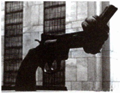 示例:联合国总部花园内,有一座青铜雕塑,那是一把手枪,但是枪管被打上一个结,名曰“打结的手枪”。这是卢森堡 1988 年赠给联合国的。这一雕塑的含义很明显,那就是反对战争,拒绝杀戮。