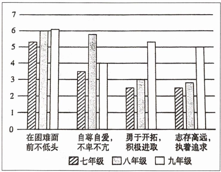 23.自强有自己的自强和国家的自强两个层面;对于个人来说,自强主要指奋发向上,不断提升自我;七、八、九年级的同学能做到“在困难面前不低头”的最多。