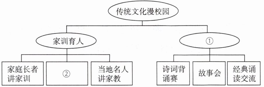 (1)【补计划】下面是某中学“传统文化漫校园”活动计划的初步构思框架图,请在这个构思框架图的空缺处补上相应内容。(2 分)