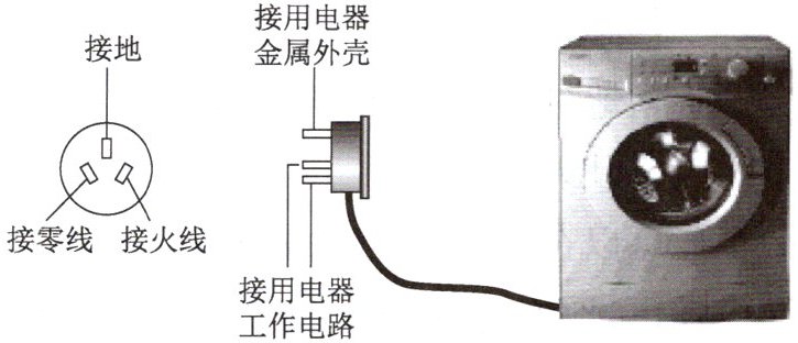 (2)金属外壳通过三脚插头接地,漏电时电流经地线流入大地,人体接触外壳无电流通过,避免触电。