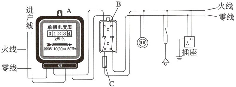,它的作用是控制整个家庭电路的通断.(4) 元件 C 是