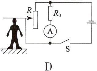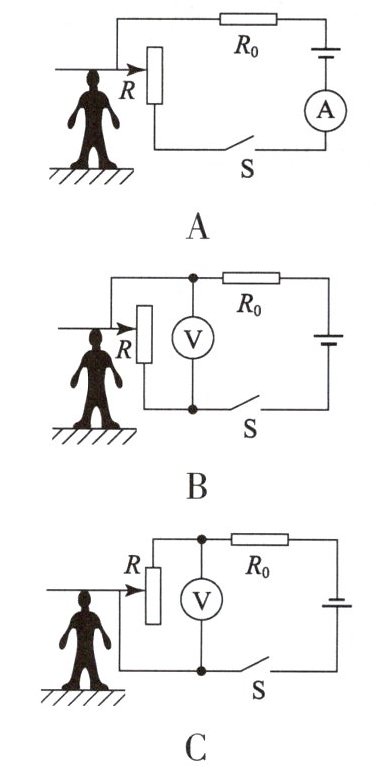 [典例2]小梦为济宁市体育测试设计了一个电子身高测量仪。图中的$4$个电路中,$R_{0}$是定值电阻,$R$是滑动变阻器,电源电压不变,滑片会随身高上下移动。下列能够实现身高越高,电压表或电流表示数越大的电路是(