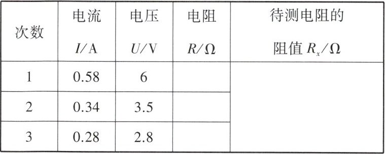(4) 实验记录表(请根据表格内数据计算出待测电阻$R_x$的阻值)。