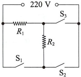 7. 如图是一种家用电烤箱内部结构电路简图,它有高、中、低 $ 3 $ 个挡位。已知 $ R_1 = 120 \Omega $,$ R_2 = 240 \Omega $。