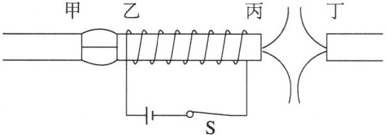 9. 如图为条形磁体、电磁铁及标出的磁感线。磁极甲、乙、丙、丁的极性依次是(