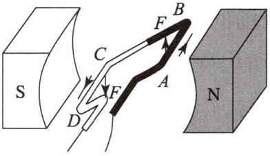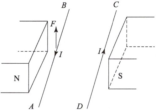 1. 如图所示,通电导线AB在磁场中受到一个向上的力的作用。请判断通电导线CD在磁场中的受力方向,并说明判断理由。