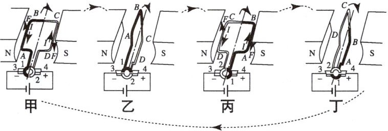 (2)对比图丙和图甲,线圈中电流的方向发生了怎样的变化?线圈的受力方向及其转动方向如何?图丁中线圈又重新回到了平衡状态,综合分析线圈转动一周过程中,线圈中电流方向改变了几次,实现了线圈继续重复转动?