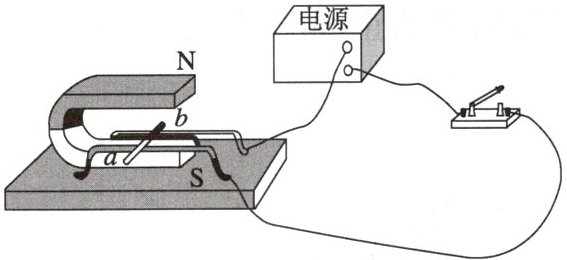 的实验装置。某同学利用该装置进行实验时,他把开关闭合后,观察导体AB运动的情况;然后将导线的a端和导线的b端的位置对调,再观察导体AB的运动情况,目的是研究通电导体在磁场中受力的方向跟电流方向的关系
