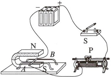 [典例3]江涛用如图所示的实验装置探究“磁场对通电直导线的作用”.闭合开关S,原本静止的轻质硬直导线AB水平向右运动.要使AB水平向左运动,下列措施中可行的是(