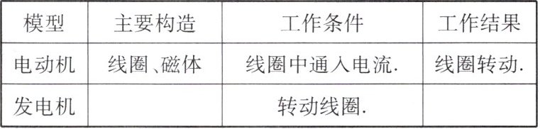 观察课本中发电机模型,对比课本中电动机模型的主要结构及工作条件,填写下表。