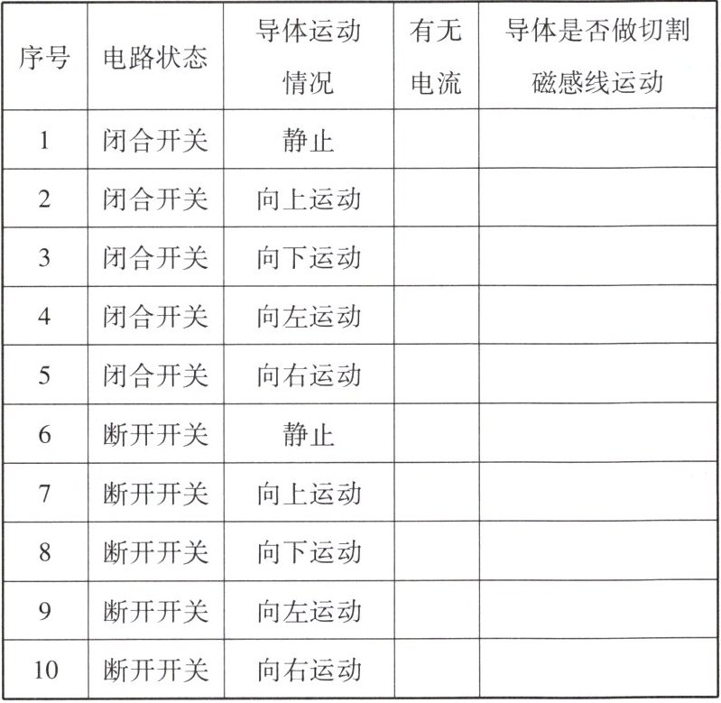 (2) 按照下表中的内容进行实验,观察在什么情况下电路中能产生电流(灵敏电流计指针发生偏转),并把有无电流填入表格。