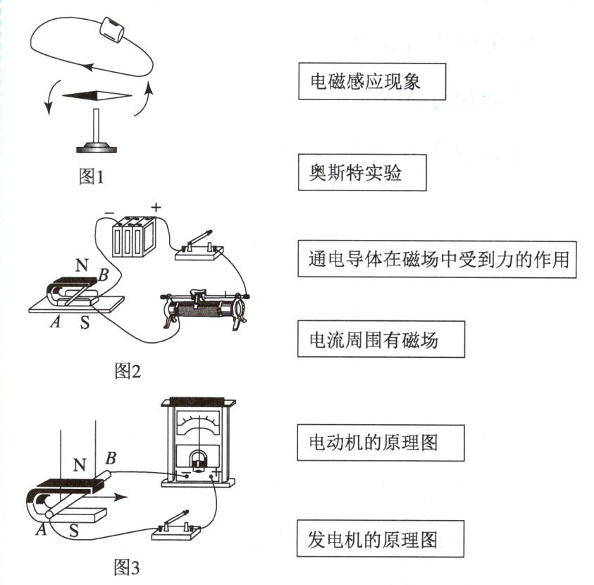 图1-奥斯特实验、电流周围有磁场;图2-通电导体在磁场中受到力的作用、电动机的原理图;图3-电磁感应现象、发电机的原理图