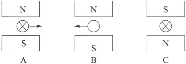 4. 闭合电路中的一部分导体在磁场中运动产生感应电流的情形如图A所示. 根据图A分别在图B、C中画出感应电流方向或导体运动方向. (⊗表示电流方向垂直纸面向里,⊙表示电流方向垂直纸面向外.)