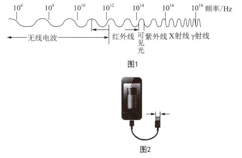 2. 图1是电磁波家族.智能手机与智能手环的“近场通讯”使用$1.356×10^7Hz$这个波段的无线电波进行通讯(图2).在手机耳塞孔插入红外线发射器,手机变身传统的电视遥控器,手机发出红外线的波长较“近场通讯”的波长