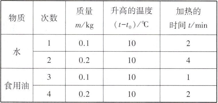 8. 某同学在做“比较不同物质吸热的情况”实验时,使用相同的酒精灯给水和食用油加热,用加热时间的长短来表示物质吸收热量的多少,得到如下数据: