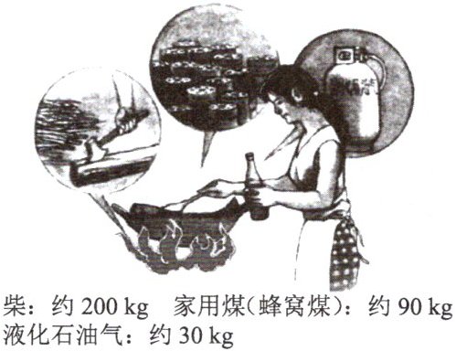 柴:约 200 kg 家用煤(蜂窝煤):约 90 kg 液化石油气:约 30 kg